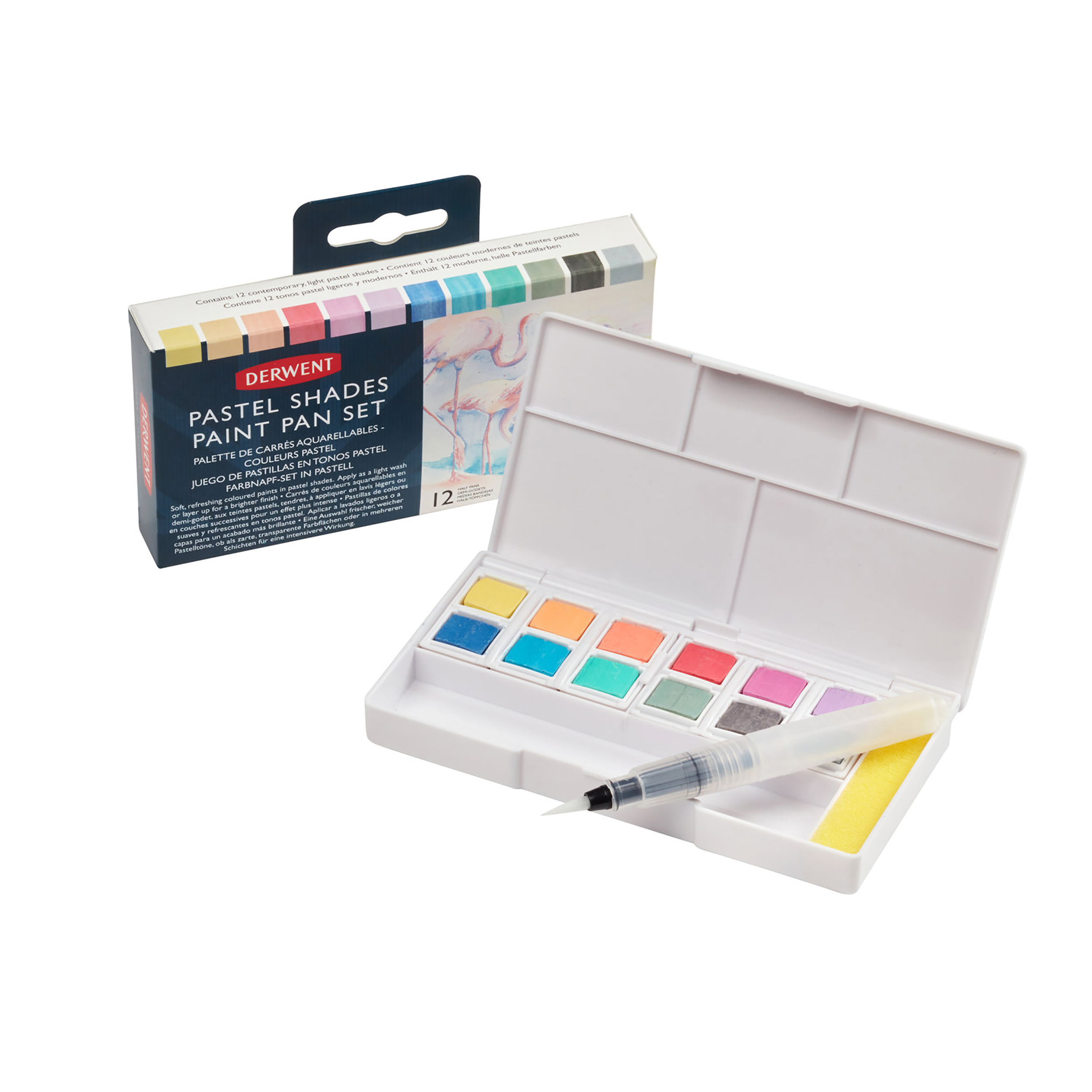 • Set contains, 12 paint pans, five mixing palettes and a sponge to clean the waterbrush