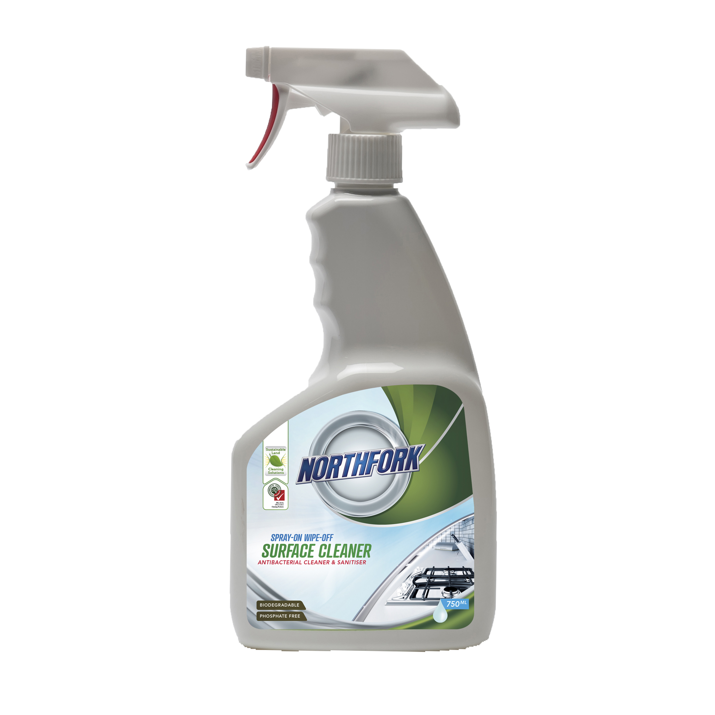 Environmentally preferable products certified by GECA, Good Environmental Choice Australia. Northfork Spray On Wipe Off is an environmentally friendly cleaner and degreaser for tables, benches, walls and other hard surfaces.