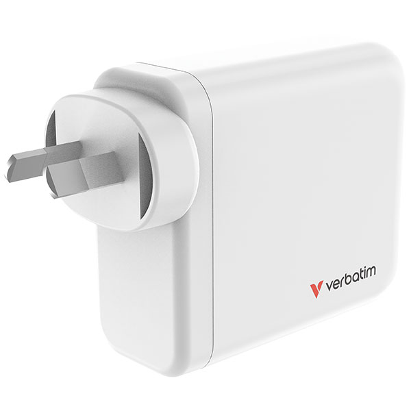 Verbatim#s 140W GaN Wall Charger consolidates multiple chargers into one, combining two USB-C PD 140W ports, one USB-C PD 20W port and one USB-A QC 3.0 port. Ideal for the office, home or travelling to power your laptop, smartphone, and more.